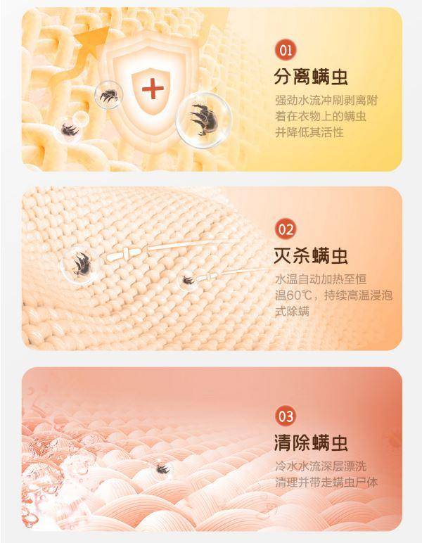 宝宝的皮肤厚度只有成年人的1/10,因此对于螨虫和细菌的抵御力都更弱,螨虫一般会在22℃-30℃温度环境下繁殖生存,在55℃温度下会被逐渐杀灭。海信XQB30-M108LH迷你洗衣机提供了有效解决方式,即60℃巴氏除菌洗,先通过强劲水流冲刷衣物剥离螨虫并使其失去活性,接着借助60℃恒温对螨虫进行杀灭,最后再借助冷水水流冲走螨虫尸体,此模式下绝大多数细菌病菌也会得到有效清除,其效果达到“食品级”标准。更令人欣喜的是,该模式不会对衣物材质纤维造成影响,能够让衣物持久焕新。