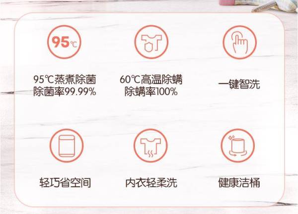 由于好动的天性,宝宝们经常会在地面上各种调皮玩耍,因此可能会沾染上相比成年人更多的细菌和微生物,如果不及时清洁干净就会对身体健康带来影响。海信母婴迷你洗衣机自带95℃蒸煮除菌功能,在高温和水流的双重冲击下,各种细菌病菌都将无处遁形,除菌率达到99.99%,最终清洗后的贴身衣物会更加柔软,宝宝们穿着起来也会更加舒适。不过需指出的是,羊毛真丝材质的衣物不宜在该模式下清洗,可能会造成衣物缩水或材质损伤等问题。