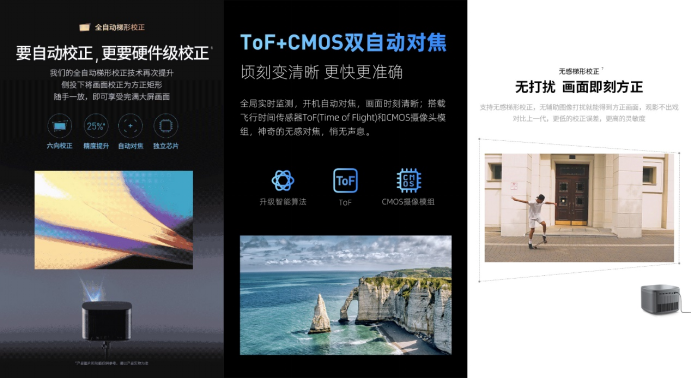 现如今市场上的智能投影,已经有越来越多的品牌开始研发自动梯形校正功能,为用户带来更加智能体验。当贝F5和坚果J10S也不例外,坚果J10S使用无感梯形校正(TOF),当贝F5使用自动无感梯形校正(TOF+CMOS双自动对焦),在一定程度上保证了画面校正的速度,但画面校正的精度却不稳定,经常会出现偏移。