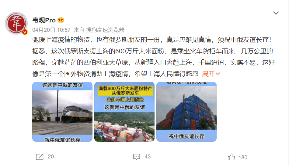 最近,社交网络上流传着一个说法,俄罗斯向上海援助了600万斤大米和面粉,用以支持防疫。传播这类信息的文章或视频烘托出了一种俄罗斯在战争期间,百忙之下还能不远千里,远驰上海的友好气氛,流量也是比较高的。但实际上,这条信息并非事实。