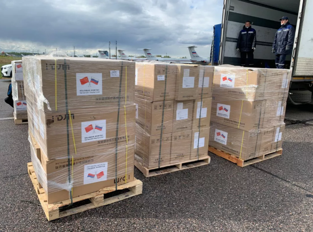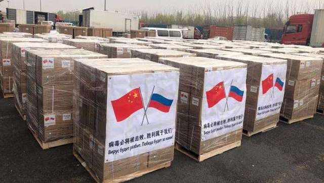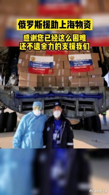 首先很多有着类似内容的视频或文章,使用的配图或视频素材驴唇不对马嘴。比如这张,图中是一组打包的物资,贴着中俄国旗,写着抗疫标语。但这实际上是一张旧图,是2020年时,我国援助俄罗斯防疫物资的图片。可以看到这张海报贴在了很多批次的支援物资上。另外,还有很多中俄物资交接人员合影的图片,实际上也是2020年的。