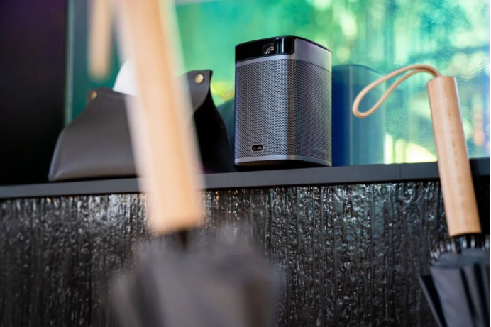 既然是能够随时带走的智能投影,极米Play超悦版自然拥有足够轻巧的外观设计。圆柱体的机身,高约14.7cm,与iPhone 13 Pro相差无几,重量仅有0.9kg,与矿泉水瓶相似,就算单手握持也基本不成问题,户外野营也能够随身携带。