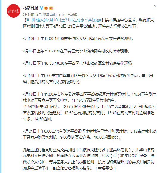 接市疾控中心通报,现有顺义区检测阳性人员于4月10日-21日在平谷活动,现将该人行程公告如下: