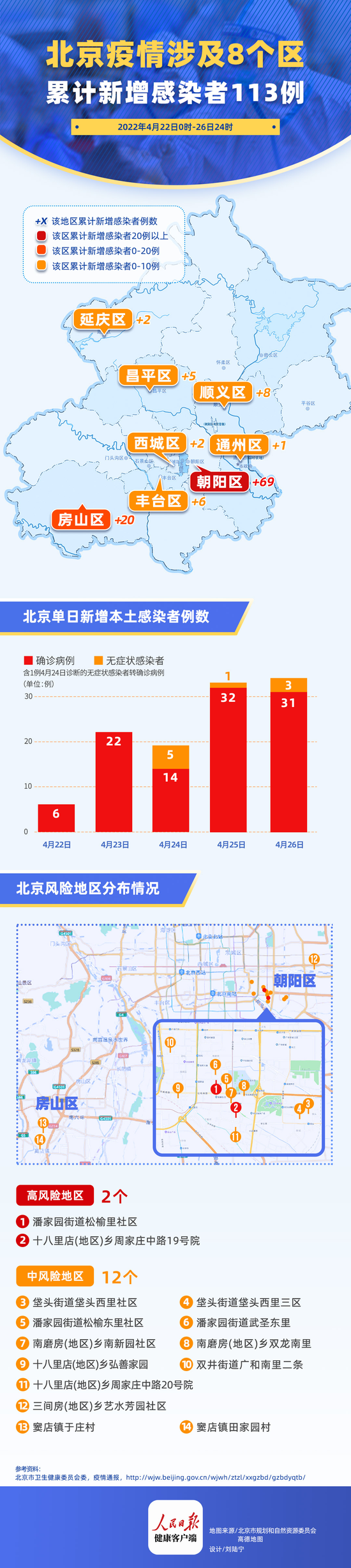 4月22日至4月26日,北京市累计报告105例新冠肺炎确诊病例,涉及京内8区。其中,朝阳区67例、房山区20例、顺义区8例、西城区2例、昌平区5例,丰台区5例、通州区1例、延庆区2例。初步流调结果显示,目前疫情已隐匿传播一周,涉及学校、旅行团及多个家庭,短期内出现了多代病例。