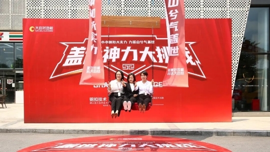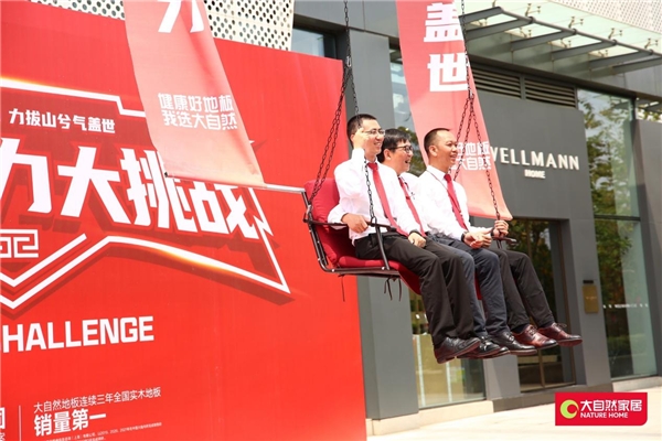 活动现场,大自然家居集团副总裁兼品牌部总经理林皓先生,大自然家居集团副总裁兼地板事业部总裁饶海清先生,实木地板运营中心总经理李建平先生,首先在大家的簇拥下,一起坐上了由专用钢扣吊起来的秋千上。在大家的欢呼声中,秋千被吊车的机械臂缓缓吊起。就这样,总裁被吊起来了!