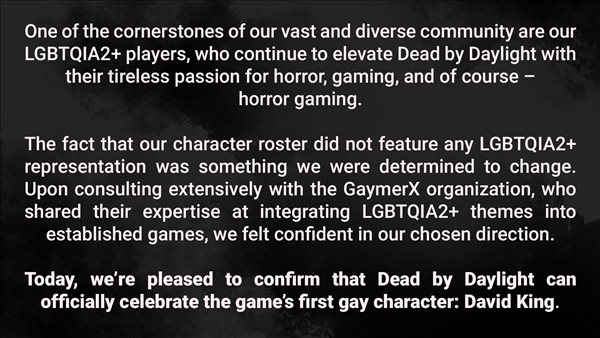 开发商Behavior Interactive在一篇冗长的声明中确认,《黎明杀机》游戏角色大卫·金是一位同性恋角色。官方解释称LGBTQIA2+玩家是其社区的“基石”,确保游戏的角色“代表我们庞大而多样化的社区”是“不可或缺的”。直到现在, 《黎明杀机》仍缺乏一个已确认的LGBTIA2+角色,而Behavior已经“决心改变”。