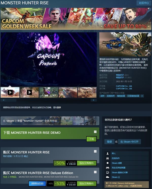 作为一名资深游戏宅,随时掌握Steam、Epic、GOG等平台的夏季特卖、冬季特卖以及每周特惠等优惠资讯应是基本技能。今天小编为大家带来新一轮特价促销游戏资讯,卡普空目前在Steam开启共斗狩猎游戏《怪物猎人:崛起》新史低半价促销,原价396元,现仅售198,走过路过不要错过。
