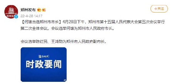 4月28日下午,郑州市第十五届人民代表大会第五次会议举行第二次全体会议。会议选举何雄为郑州市人民政府市长。