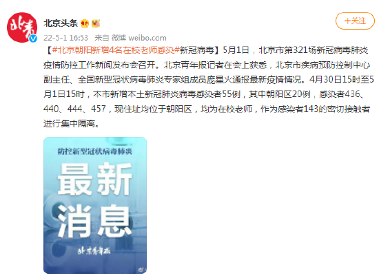 5月1日,北京市第321场新冠病毒肺炎疫情防控工作新闻发布会召开。北京青年报记者在会上获悉,北京市疾病预防控制中心副主任、全国新型冠状病毒肺炎专家组成员庞星火通报最新疫情情况。4月30日15时至5月1日15时,本市新增本土新冠肺炎病毒感染者55例,其中朝阳区20例,感染者436、440、444、457,现住址均位于朝阳区,均为在校老师,作为感染者143的密切接触者进行集中隔离。