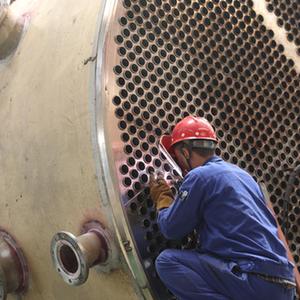 初见牛克良时,他正在工作台面上进行焊接作业。左手捏着手工焊丝,沿着换热管划着弧线,火星四射,右手则紧握着防护面罩。他面前静卧着数十米长的圆筒形不锈钢换热器,7米多高的端面近3000根换热管需要焊接。