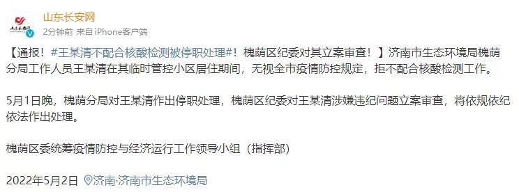 5月2日,山东济南槐荫区委统筹疫情防控与经济运行工作领导小组(指挥部)发布通报:济南市生态环境局槐荫分局工作人员王某清在其临时管控小区居住期间,无视全市疫情防控规定,拒不配合核酸检测工作。5月1日晚,槐荫分局对王某清作出停职处理,槐荫区纪委对王某清涉嫌违纪问题立案审查,将依规依纪依法作出处理。