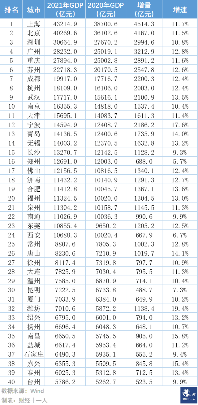 这种状况让市场各方都感到不安。2022年春节过后,全国各地的房地产政策开始调整。两个多月过去了,政策效果如何?《财经十一人》做了一番研究。研究对象是2021年GDP排名前40的城市(见表1)