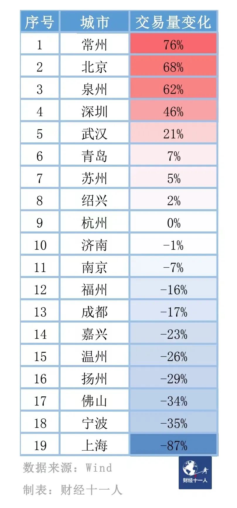 在19个城市中,上海由于疫情管控原因暂不考虑。其他18个城市,4月比3月回暖的城市有8个。其中,常州、北京、泉州、深圳成交量大幅上升45%以上。常州和泉州交易量上升主要由于3月交易量同比都下降了80%以上。所以,这两个城市是因为3月过冷导致的转暖,城市本身“并不暖”。