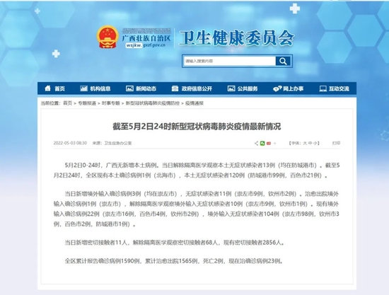 5月2日0-24时,广西无新增本土病例。当日解除隔离医学观察本土无症状感染者13例(均在防城港市)。截至5月2日24时,全区现有本土确诊病例1例(北海市),本土无症状感染者120例(防城港市99例,百色市21例)。