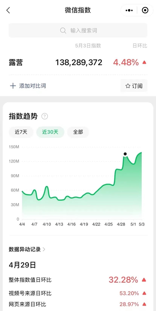 露营的火,还有一些整体数据来佐证。有旅行平台的数据显示,进入4月以来,平台上露营相关词汇搜索量同比增长2.5倍,是2020年同期的4倍,今年露营相关产品(住宿、出游)预订量是去年的3倍左右。