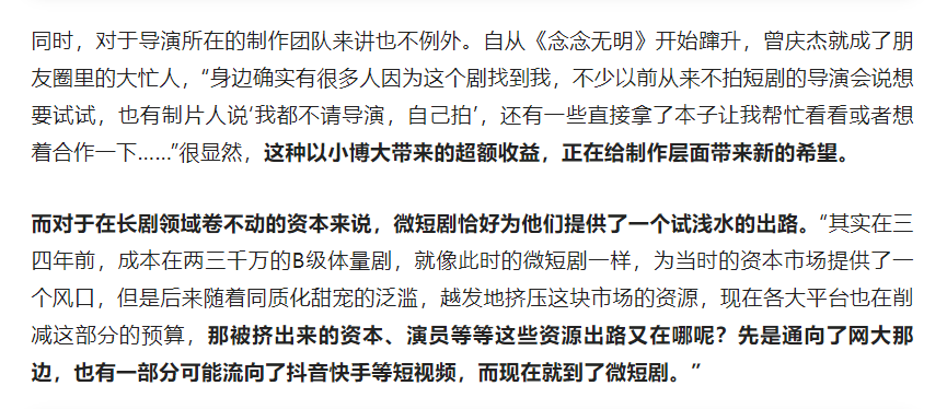 此外,将故事讲好、将内容创意而不是演员IP化,对于不能采用达人带货方式的长视频平台与非MCN的影视公司可能会是一种利好。《念念无明》的弹幕中,已经有不少网友表示想看到这个故事被扩充为更精品的长剧。拿到B站投资的微短剧厂牌兔狲文化,起初也是希望通过微短剧进行创意试水与IP孵化。