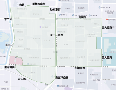 东二环以东,广和路、垂杨柳南街及南磨房路以南,西大望路以西,十里河斜街、左安路和松榆南路以北的合围区域(中国医学科学院肿瘤医院、北京市垂杨柳医院和北京工业大学部分区域除外),涉及劲松、潘家园、双井、十八里店等4个街道和地区。