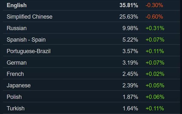 用户界面语言方面,占比最高的英文和简体中文都略有下滑,俄文、西班牙文(西班牙)、葡萄牙文(巴西)等略有上涨。