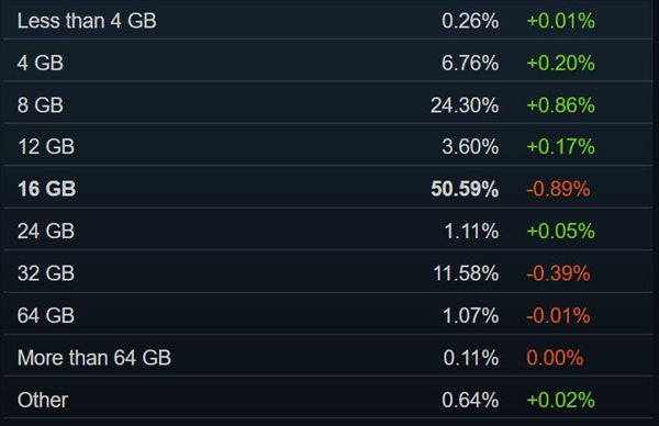 内存方面,有更多玩家选择了8GB内存,不过16GB内存仍占据领先地位,总占有率为50.59%。