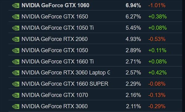 Steam每月都会收集客户正在使用的电脑软硬件种类的数据(非强制参与),并会定时分享以便开发商决定该投资开发哪些技术、提供哪些产品。日前Valve公布了2022年4月份的硬件调查结果,尽管GTX 1060还占据显卡使用率榜首,但在4月它所占份额下跌1.01%。