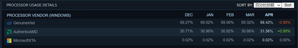 处理器方面,大致是Intel与AMD七三开,其中Intel处理器的占有率下降0.9%,而AMD提升0.9%。