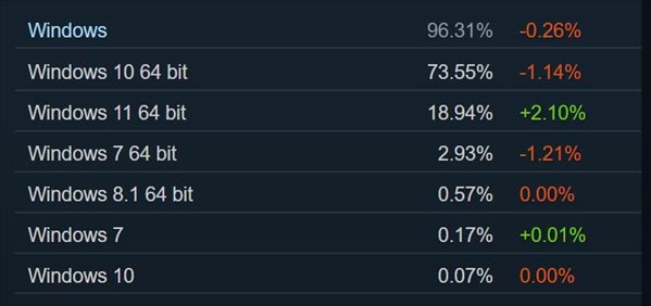 在操作系统方面,Windows 10的占有率仍在下跌,4月份跌了1.14%,而Win11则增长了2.10%,不过两者间的差距还非常远。