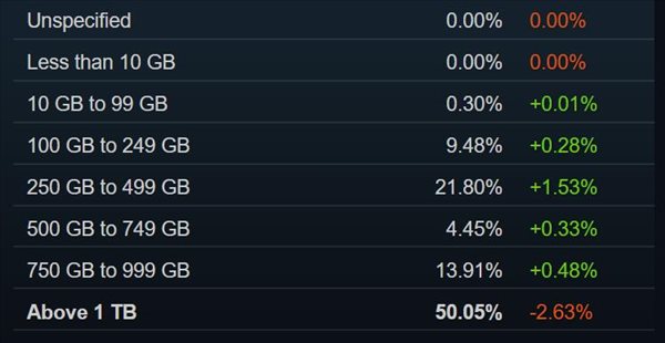 总硬盘空间方面,有50.05%的玩家电脑拥有高于1 TB的总硬盘空间,21.80%的玩家电脑是250 GB ~ 499 GB,而13.91%的玩家电脑是750 GB ~ 999 GB。