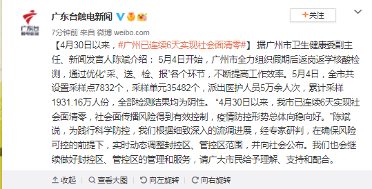 据广州市卫生健康委副主任、新闻发言人陈斌介绍: 5月4日开始,广州市全力组织假期后返岗返学核酸检测,通过优化“采、送、检、报”各个环节,不断提高工作效率。5月4日,全市共设置采样点7832个,采样单元35482个,派出医护人员5万余人次,累计采样1931.16万人份,全部检测结果均为阴性。 “4月30日以来,我市已连续6天实现社会面清零,社会面传播风险得到有效控制,疫情防控形势总体向稳向好。”陈斌说,为践行科学防控,我们根据细致深入的流调进展,经专家研判,在确保风险可控的前提下,实时动态调整封控区、管控区范围,并向社会公布。我们也会继续做好封控区、管控区的管理和服务,请广大市民给予理解、支持和配合。