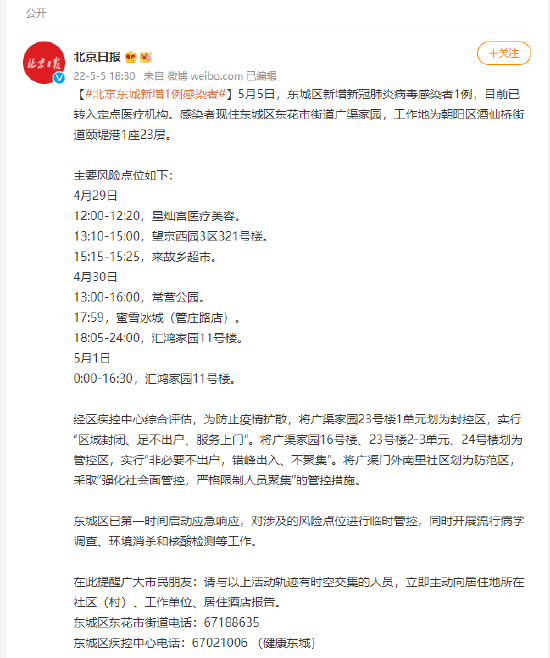 5月5日,东城区新增新冠肺炎病毒感染者1例,目前已转入定点医疗机构。感染者现住东城区东花市街道广渠家园,工作地为朝阳区酒仙桥街道颐堤港1座23层。