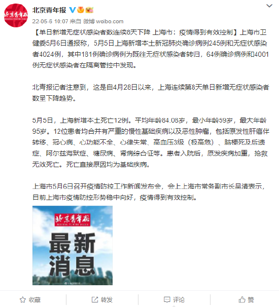[单日新增无症状感染者数连续8天下降 上海市:疫情得到有效控制]上海市卫健委5月6日通报称,5月5日上海新增本土新冠肺炎确诊病例245例和无症状感染者4024例,其中181例确诊病例为既往无症状感染者转归,64例确诊病例和4001例无症状感染者在隔离管控中发现。