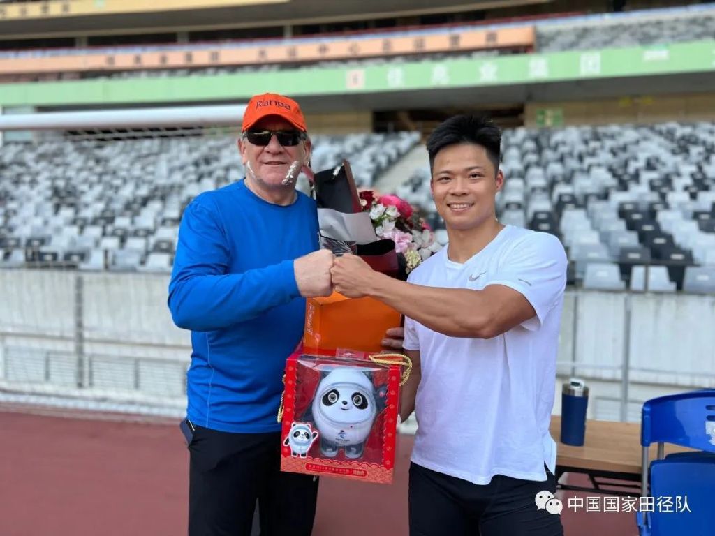5月4日,恰逢青年节,苏炳添与队友们一同为兰迪准备了特别的回归欢迎仪式,还为教练送上了北京冬奥会的吉祥物“冰墩墩”。