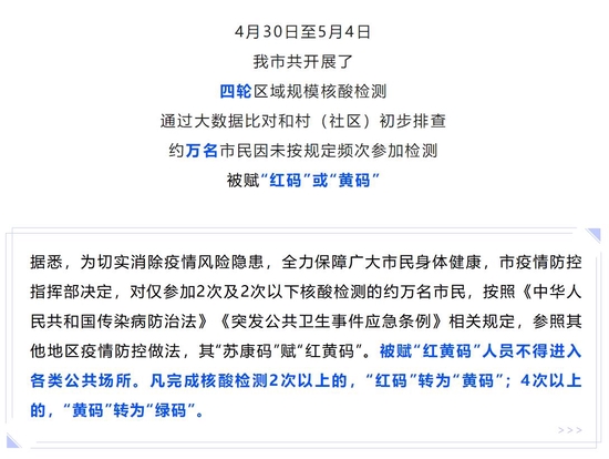4月30日至5月4日,江苏省靖江市共开展了四轮区域规模核酸检测,通过大数据比对和村(社区)初步排查,约一万名市民因未按规定频次参加检测,被赋“红码”或“黄码”。