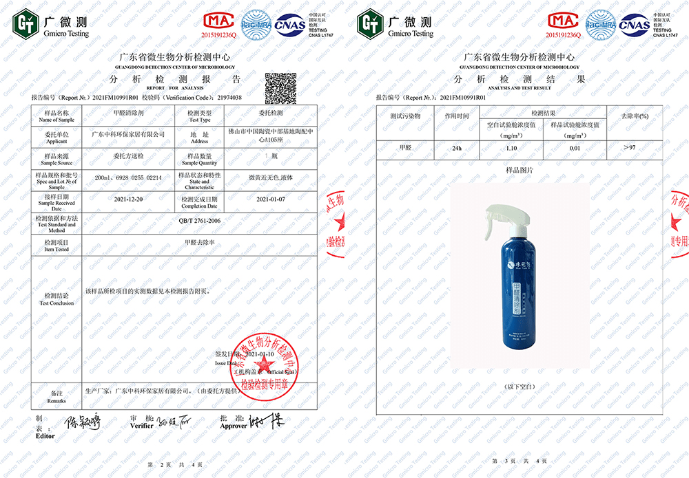 使用中科环保改性复合酶除醛时,先将喷头调为雾化状态,喷嘴距离被喷涂物表面25~40cm,全面均匀的喷洒在物体表面,避开金属部分;喷涂后,先关闭门窗及柜子,12小时后打开通风即可;广东省微生物分析检测中心的分析结果显示,24小时除醛率大于97%。