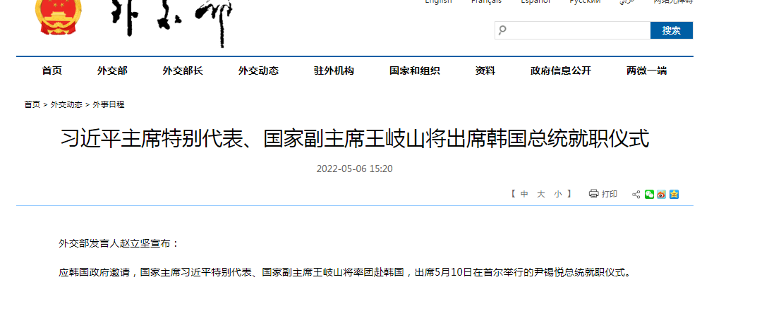 应韩国政府邀请,国家主席习近平特别代表、国家副主席王岐山将率团赴韩国,出席5月10日在首尔举行的尹锡悦总统就职仪式。