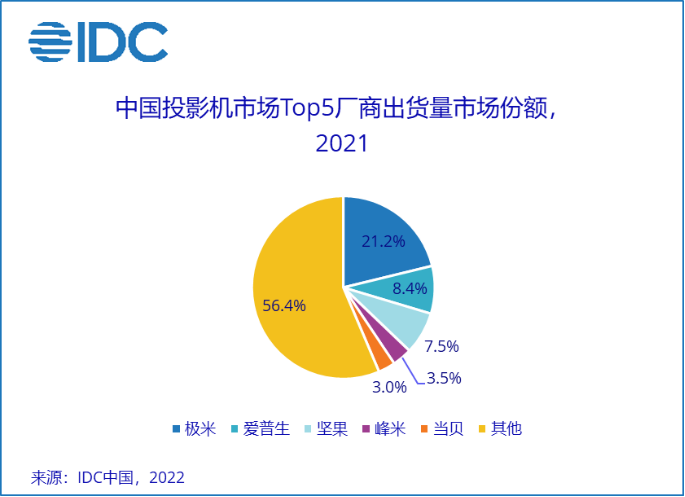 上个月,国际知名研究机构IDC也公布了《IDC 2021年第四季度中国投影机市场跟踪报告》,全面解析了中国投影机市场的现状:极米科技以21.2%的国内全年出货量占比位居“国内投影市场出货量第一”,市场占有率超过第二到第四名总和,展示出毋庸置疑的行业领军实力。