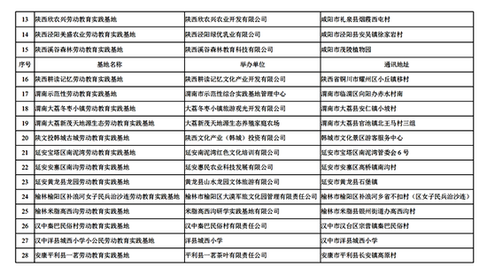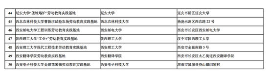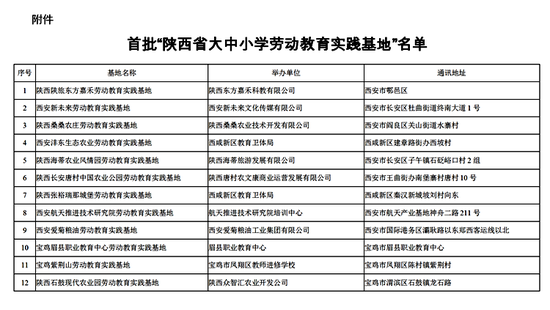 劳动教育是学生成长的必要途径,实践基地是全面落实劳动教育课程的重要平台。记者今天(5月7日)从陕西省教育厅了解到,为切实推进劳动教育顺利开展,陕西省教育厅组织了省级大中小学劳动教育实践基地评选工作。在各地各高校推荐的基础上,经专家评审、网上公示和厅务会研究,决定命名陕西陕旅东方嘉禾劳动教育实践基地、西安沣东生态农业劳动教育实践基地、西北农林科技大学曹新庄试验农场劳动教育实践基地等50家为首批“陕西省大中小学劳动教育实践基地”。