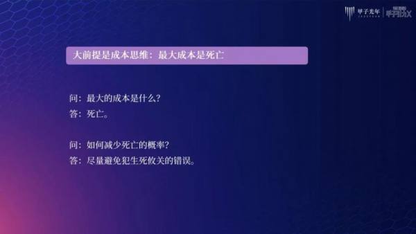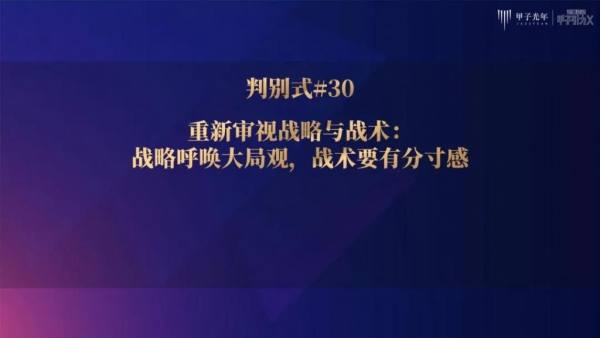 最后我想说一下最后一个判别式,就是重新审视战略与战术。战略战术,企业家群体们总喜欢谈这两个概念。战略告诉我们什么仗是要打的,什么仗是不打的,战略一定要有大局观,去年甲子引力我们分析了很多关于大局观的事情,在此不多赘述了,而今天此时此刻,更重要的更难的其实是战术问题,就是当战略上来讲我们都知道,我们追求和平,我们追求康复,我们追求经济的复苏,但是战术上储备多少子弹,上膛多少子弹,子弹该怎么瞄准,何时扣动扳机,这是战术问题,战术是很难的,战术要做到分寸感,是需要艺术和智慧的。