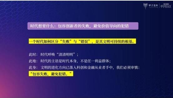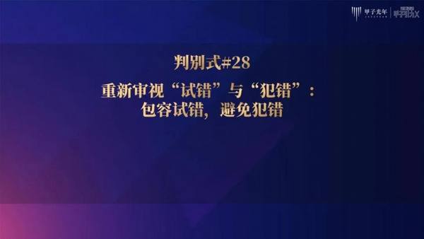 失败一定是没有办法做到100%避免的,比如说当我对未来做出40条判断,50条判断的时候,可能确实有四五条判断它是不对的,但是我不能因为这个就不做未来的判断本身,但是错误必须要努力避免的。而下一个思考题就是一个时代应该如何去判别到底什么是"失败",什么是"错误"。这也是一个非常非常重要的思考题。