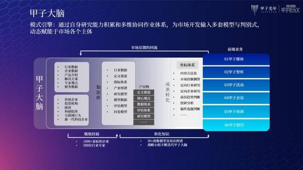 底座是今年我们全新升级的模式引擎,就是甲子大脑,本质上来讲,甲子光年是一个有一半的工作人员都是研发人员的这样一个团队,我们有一半的人都是分析师,我们在用不同的形式构建甲子大脑的养料,有的是数据,有的是模型,有的是方法论,有的是指数,有的是采访反馈机制,专家网络的运营机制,那么在这一系列的这样的一个循环当中,我们内部叫一句话,就是从甲子大脑来,到甲子大脑去,就是不断地用甲子大脑生成的模型,坐标系,观点,来滋养我们前端的媒体、智库、活动、会员、培训、投行等等的业务,然后从市场当中获得及时的反馈,再反哺到我们的甲子大脑当中,构成我们的一个正向循环的不断进化的体系,这也是我们提出甲子的坐标系是一个进化体系的一个最基本的信心的来源。