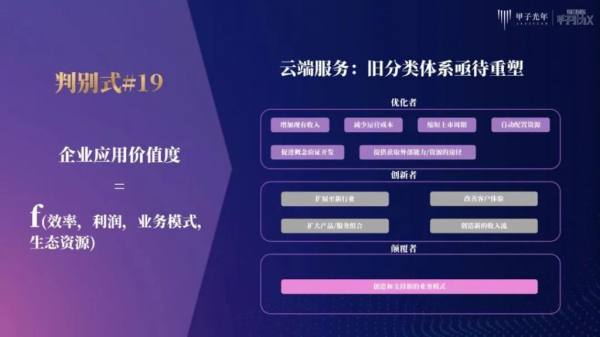 比如说就直播而言,原来直播可能是垂直的公司使用的工具,但是今天可能非常多的公司都使用直播,直播就变成了一个通用的SaaS,所以从这个角度的话我们会看到,云端服务正在进行新的分类,而在这里我们给出了一个判别式,就是企业应用的价值度,它其实是在效率,利润,业务模式和生态资源方面,可以定位不同的企业类型。