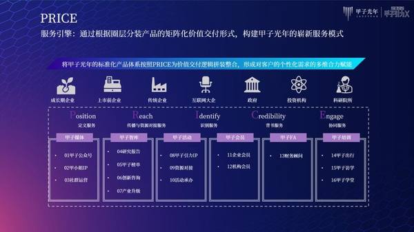 第二个关键词就是中间的我们的服务逻辑叫PRICE,这是一个有2018年在甲子引力上我提出的一个模型,这个模型之后我们就很少公开去讲,但它串联了甲子光年的标准化产品和我们的个性化服务,构成了甲子光年本身的一个服务模式和效率引擎。