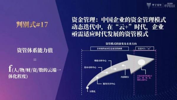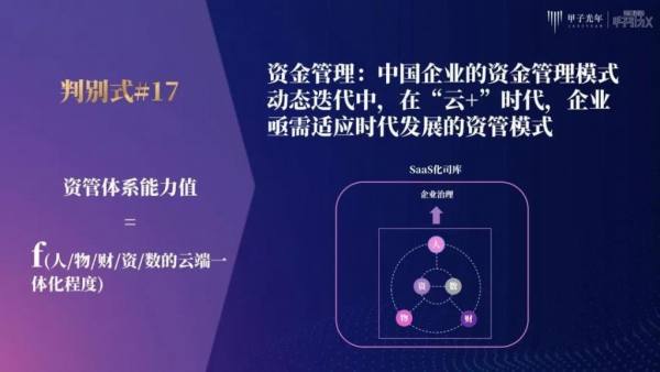 我们有一句话说挣钱的,用钱的,最后不及管钱的,中国企业的资金管理模式一直处在动态的迭代之中,尤其在"云+"时代,企业急需适应时代发展的新型的资管模式,所以我们给了一个第十七的这样一个判别式就是,资管体系的能力值是什么,它是人、物、财、资、数的云端一体化程度,注意它本身就是这几个要素的云端一体化程度,这种程度越高,你的资管体系能力值就越高。