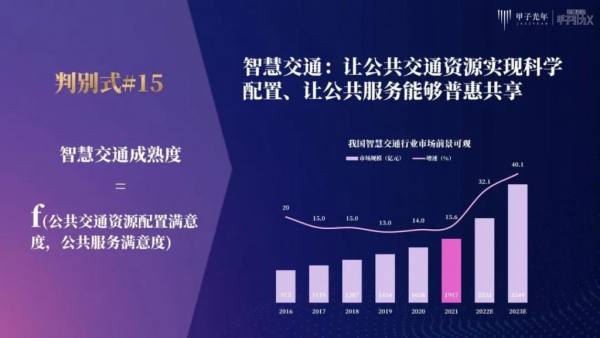 接下来我们看第十五个判别式,也是一个重点的实体经济行业,就是交通,我们的判别式是看智慧交通的成熟度,它是两个要素的一个函数,第一个要素叫做公共交通资源配置的满意度,第二个要素叫公共服务的满意度。那我有一个观点,一个真正好的智慧交通的时代,不是穷人都开私家车,而是富人愿意坐公交,如果一个智慧交通的城市,能够让公共交通资源实现科学的配置,让公共的服务能够真正地普惠,共享,这个交通才真正的智慧。