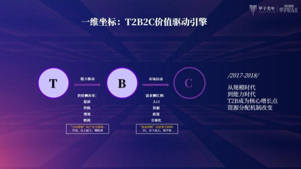 2017年成立之后,2018年,也就是甲子一周年的时候,我们在大会上分享了我们的第一个模型,叫T2B2C,然后在次一年的大会,我们分享了我们的第二个模型,叫产业科技的棋盘模型,再往后一年就是一个三维的生态模型,而再往后一年的模型就是这一次我想给大家带来新的分享,这个等会儿再去展开详解。
