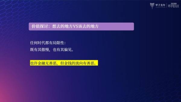 什么意思?假如比如说我们举个例子,我们谈金融,也许资本无善恶,但资本的流向有善恶,资金在任何时候都不是主语,金融永远是赋能者,是一个附庸,金融服务于实体,金融服务于科创,金融在任何时候都不能够只做想做的事情,必须做该做的事情,否则资金就会去想去的地方,而不是该去的地方,这就是割韭菜,这就是空气币,这就是当时马云说中国金融没有系统所犯的错误。