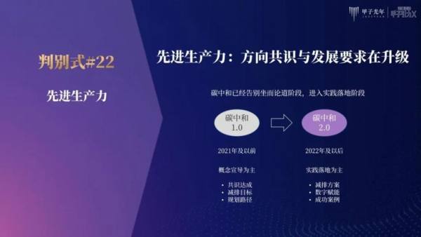 第二十二个判别式就是先进生产力的前进方向,我们都会看到我们一直在这个方向上达成的共识越来越多,越先进的数字化水平,越先进的能源利用效率,越先进的信息传输水平,就是未来的方向,这个方向是共识,而这个方向它所非共识的不是方向本身,而是方向的具体发展要求,在这个过程当中,我们所要做到的是始终和时代最先进的水平同频。
