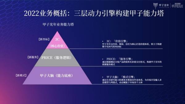 2022年甲子光年也有了新的升级,正如我们今天提出了新的坐标体系一样,今天的甲子光年我们也认为走在了一个全新的拐点之后,走在了一条全新的道路上,从简单的概括语言来进,今天的甲子光年我们可以用一个金字塔来概括我们的情况,它是一个三层的动力引擎,头顶是一个帽子,我们叫3C,底座是我们的能力底座,我们叫甲子大脑,中间是我们的服务逻辑,我们自己研发了一个模型叫PRICE。