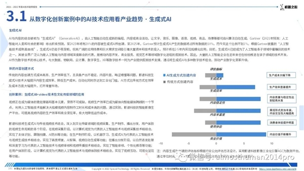 其中,专注于将人工智能视觉技术应用于内容生产领域的“生成式AI”已经成为人工智能各子领域中最瞩目的技术之一,被业界广泛认为是人工智能与内容领域深度融合的代表,是推动内容开发、商业服务、视觉艺术等领域数字化进程的底层技术。因此,大量的人工智能企业在近年来也在纷纷推进在该子领域的技术开发。AI作为数字技术的核心技术,与大数据、物联网、云计算、数字孪生、XR等数字技术一同为产业提供底层技术支撑。代表企业影谱科技通过将生成式AI与多种数字技术组合,驱动产业数字化变革升级,成为报告例举的典型AI数字化应用案例。