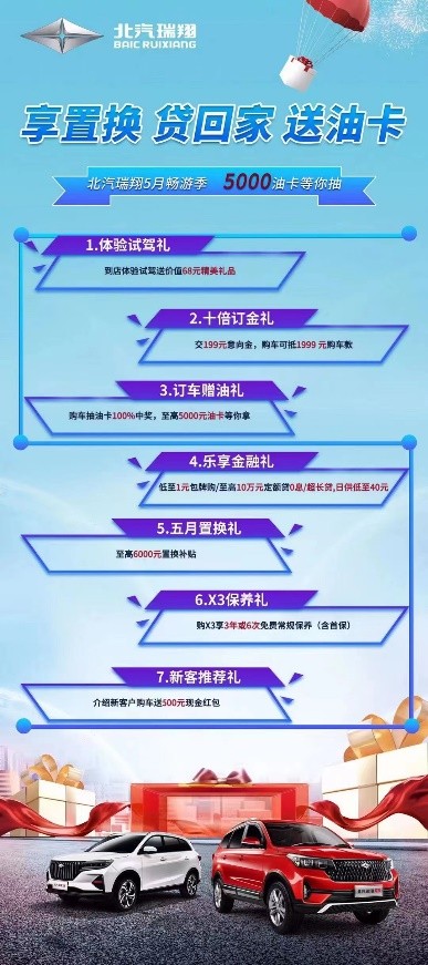 如今的油价对于普通家庭来说都会产生“加油焦虑”,正如网上吐槽“92加满魂散腿软,95加满倾家荡产……”,同时也加剧了购车焦虑。届时,北汽瑞翔开展了以“享置换、贷回家、送油卡”为主题的狂欢购活动,不买车也有礼赠,凡是到店试驾,就送精美礼品;订车即享10倍订金礼(交199元意向金,购车可抵1999元购车款);推介新客户购买还可领取500元现金红包。买车更有大礼,可享至高10万定额免息贷款政策;若置换最高可享6000元补贴;购车即送油卡,最高可得5000元油卡;购X3还能尊享3年或6次免费常规保养(含首保)。行动起来,带一辆全家人都满意的家用车回家吧!