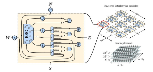 3. 模块化组件之间的宏观光学连接可以降低逻辑操作的成本 。RSG产生的光子可以传播很远的距离,而且不像传统架构那样的受到局域约束的影响。RSG之间的非局域连接提供了一套新的工具,能更有效地实现逻辑操作。